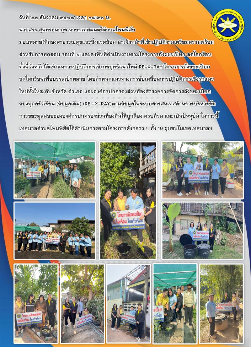 เตรียมความพร้อมสำหรับการทดสอบ รอบที่ ๔ และลงพื้นที่ดำเนินงานตามโครงการถังขยะเปียก ลดโลกร้อน ทั้งนี้จังหวัดได้แจ้งแนการปฏิบัติการเชิงกลยุทธ์แนวใหม่ RE-X-RAY