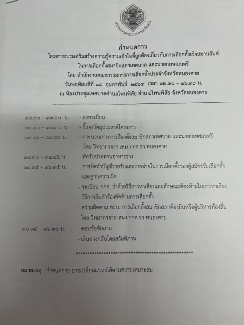 โครงการอบรมเสริมสร้างความรู้ความเข้าใจที่ถูกต้องเกี่ยวกับการเลือกตั้งเชิงสมานฉันท์ โดย สำนักงานคณะกรรมการการเลือกตั้งประจำจังหวัดหนองคาย ในวันพฤหัสบดีที่ ๑๘ กุมภาพันธ์ ๒๕๖๔ ณ ห้องประชุมเทศบาลตำบลโพนพิสัย อำเภอโพนพิสัย จังหวัดหนองคาย