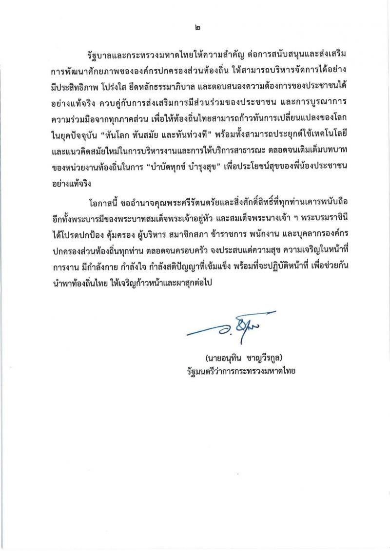 สารรัฐมนตรีว่าการกระทรวงมหาดไทย เนื่องในโอกาส “วันท้องถิ่นไทย” ประจำปี พ.ศ.2569 วันที่ 18 มีนาคม 2569 วันท้องถิ่นไทย ตรงกับวันที่ 18 มีนาคม ของทุกปี เพื่อรำลึกถึงพระมหากรุณาธิคุณของพระบาทสมเด็จพระจุลจอมเกล้าเจ้าอยู่หัว (รัชกาลที่ 5) ที่ทรงยกฐานะตำบลท่าฉลอม เป็นสุขาภิบาลท่าฉลอม ถือเป็นหน่วยการปกครองท้องถิ่นแห่งแรกของไทย เมื่อวันที่ 18 มีนาคม 2448 ถือเป็นรากฐานการปกครองท้องถิ่นและการกระจายอำนาจสู่ประชาชน