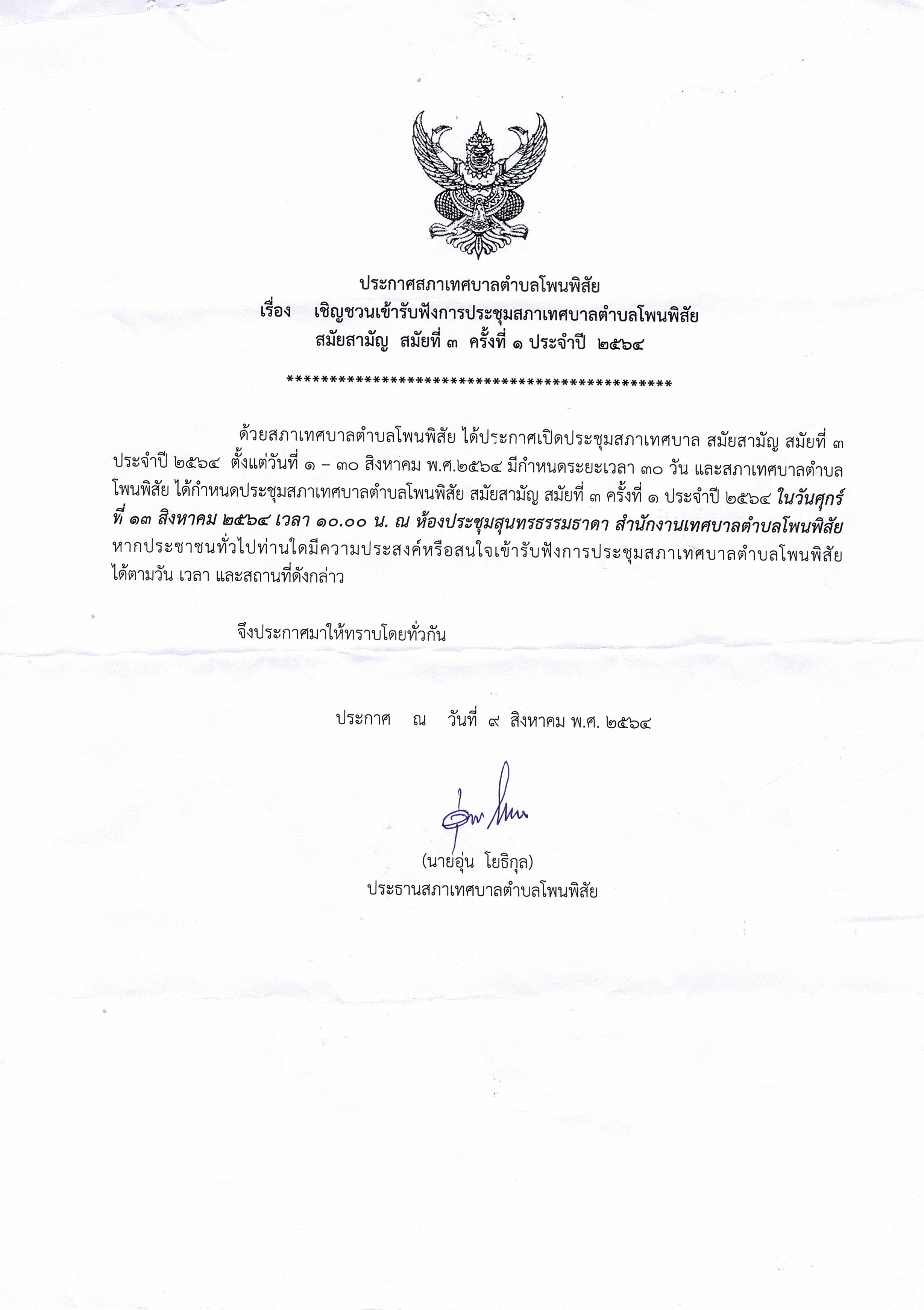 ประกาศเทศบาลตำบลโพนพิสัย เรื่อง เชิญชวนเข้ารับฟังการประชุมสภาเทศบาลตำบลโพนพิสัย สมัยสามัญ สมัยที่ ๓ ครั้งที่ ๑ ประจำปี ๒๕๖๔