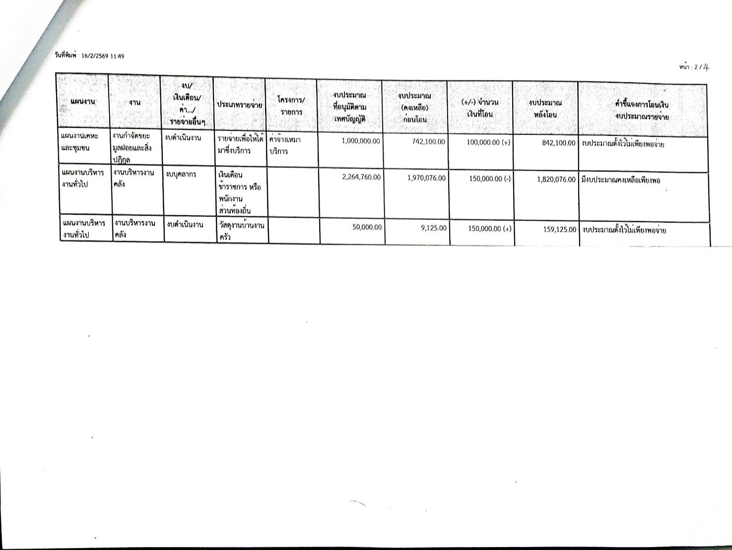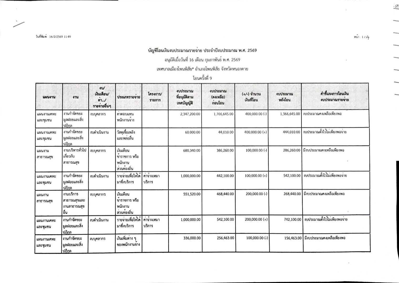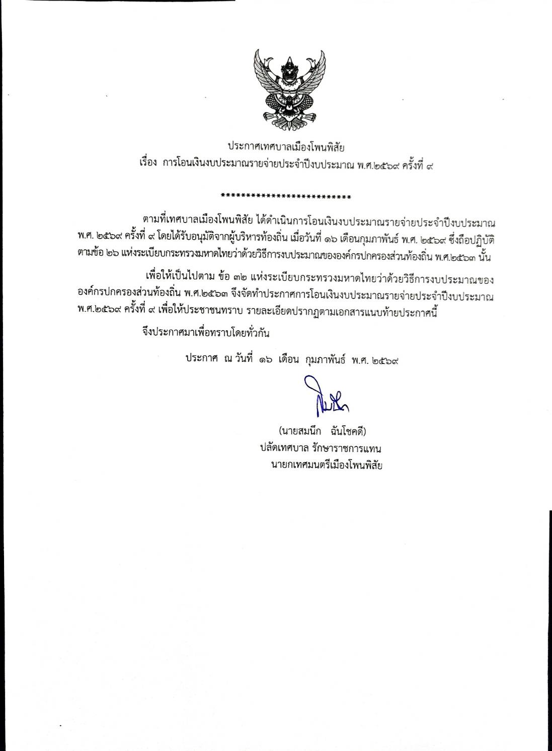โอนงบประมาณรายจ่ายประจำปีงบประมาณ พ.ศ.๒๕๖๙ ครั้งที่ ๙